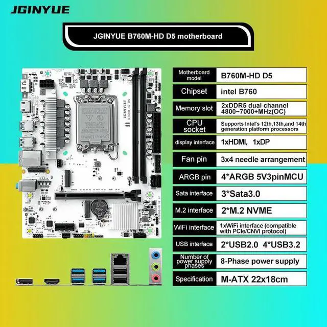 JGINYUE B760M-HD D5 Motherboard Support 1700-Pin DDR4/DDR5 Support 12th/13th/14th Gen Core i3i5i7i9 2*DDR5 2 M. 2 NVME 3 SATA 3.0