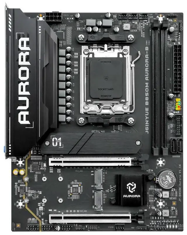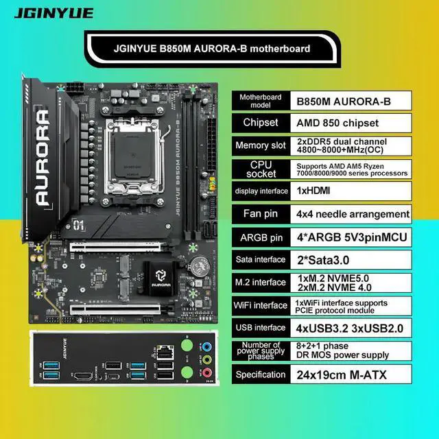 • JGINYUE B850M AURORA-B Gaming Motherboard Dual Channel DDR5 Desktop AM5 Supports R5 9700X/7500F M.2 NVMe ARGB 5V Motherboard