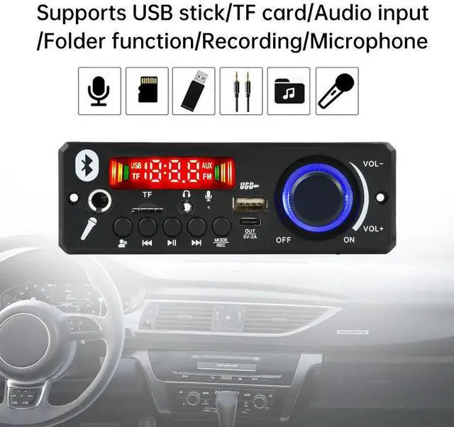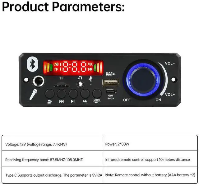 • DC 12V Bluetooth Audio Amplifier FM MP3 Audio Decoder Module Dual Channel 80W*2 Stereo Amplifier Board with LCD Display