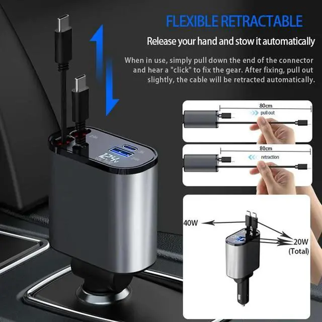 4-In-1 Fast Charger Car Charger With Dual Type-C Cables And 2 Charging Ports With Voltage Display-N33R