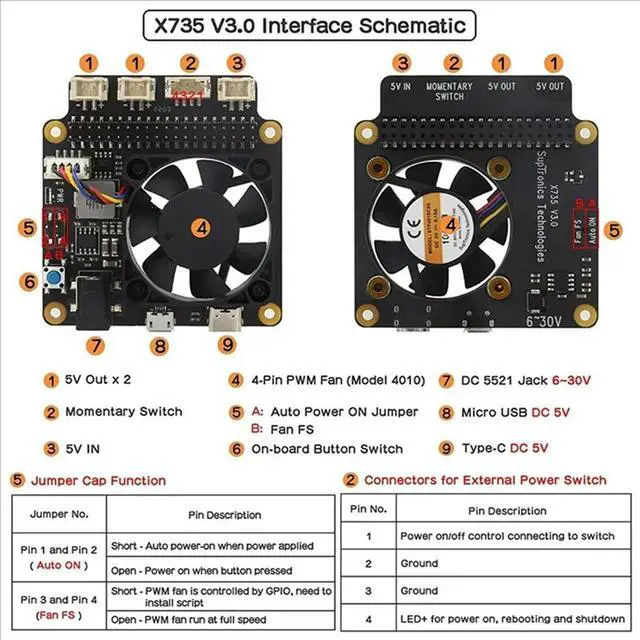 • For Pi X735 V3.0 Power Management Board With PWM Fan DC 6-30V For Pi 4B/3B+/3B/2B