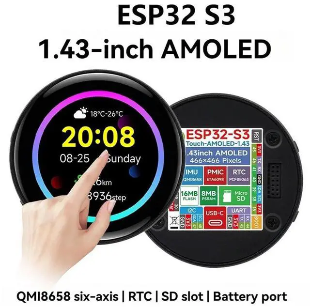 • ESP32 S3 Development Board 1.43 Inch AMOLED Display Touchscreen With SD-Port/ QMI8658C 6-Axis Sensor For LVGL