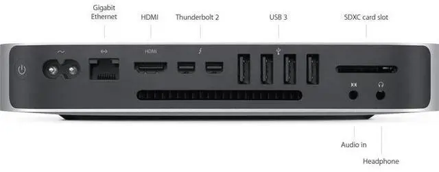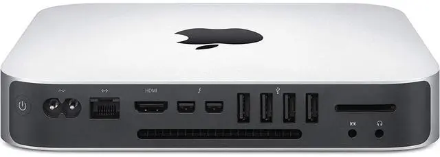 The late 2014 model Mac mini 2.6 GHz Desktop Computer from Apple is a compact form factor desktop solution for consumers who are dedicated to the look and feel of Apple brand mini computers. The small square desktops contain a 2.6 GHz Intel Core i5 dual core Haswell processor, 8GB of 1600 MHz LPDDR3 RAM and a 266GB SSD. These mini computers support dual monitor displays at 2560 x 1600 pixels. Regardless of their small size, they contain a number of connectivity options, including two Thunderbolt 2 and four USB ports, a Gigabit Ethernet RJ-45 jack and an HDMI terminal, along with an SDXC card slot for additional storage options.