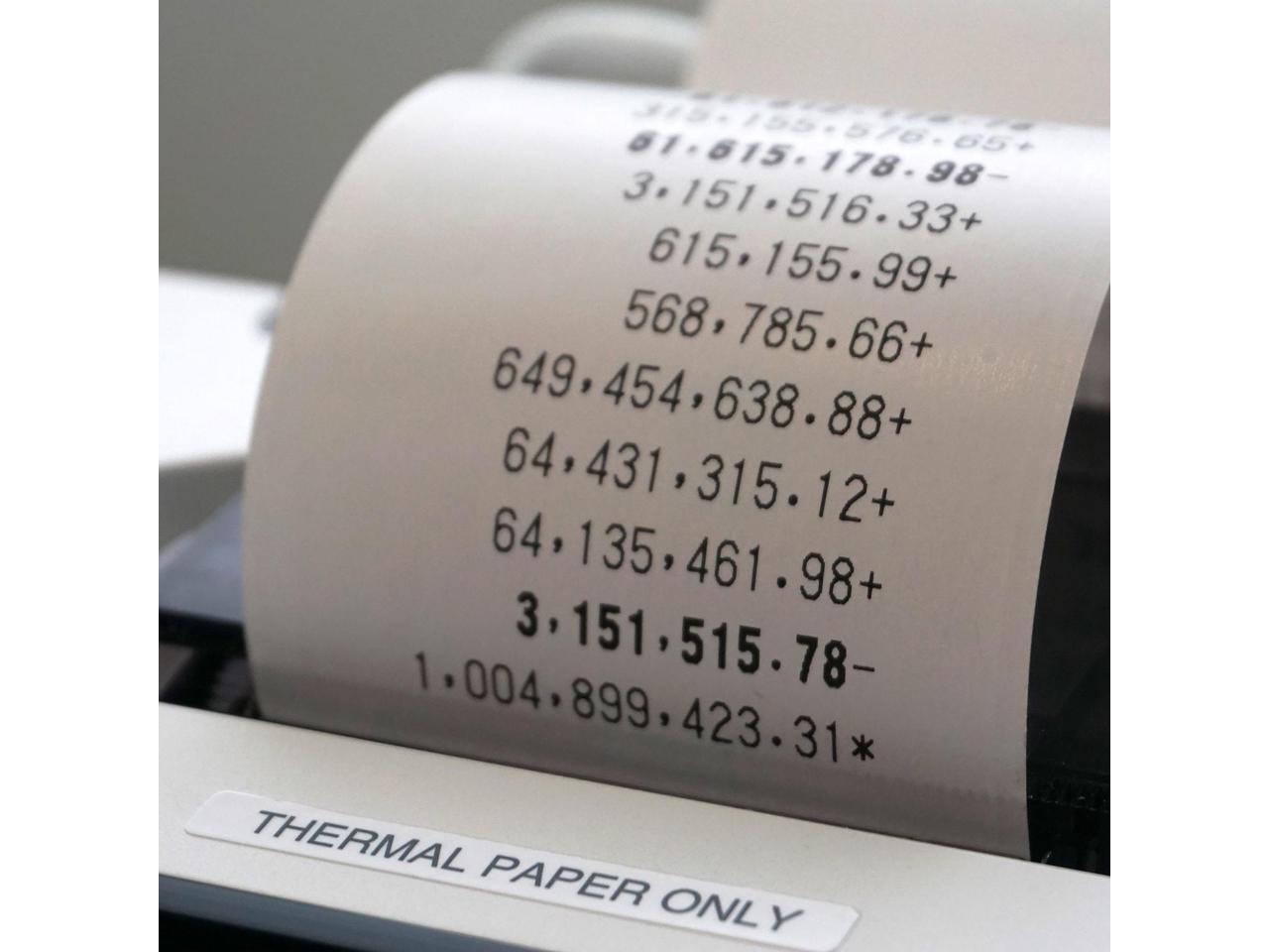 Fluorescent Extra Large LCD 10 Digit Print or 12 Digit Normal Print Size. Simply change paper rolls using loading compartment - no hassle. No Ink Needed - Thermal Paper Required.