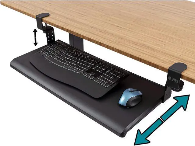 LARGE DESIGN: This keyboard shelf is wide enough to accommodate both a keyboard and mouse at 27.5" wide, 33" wide including clamps.