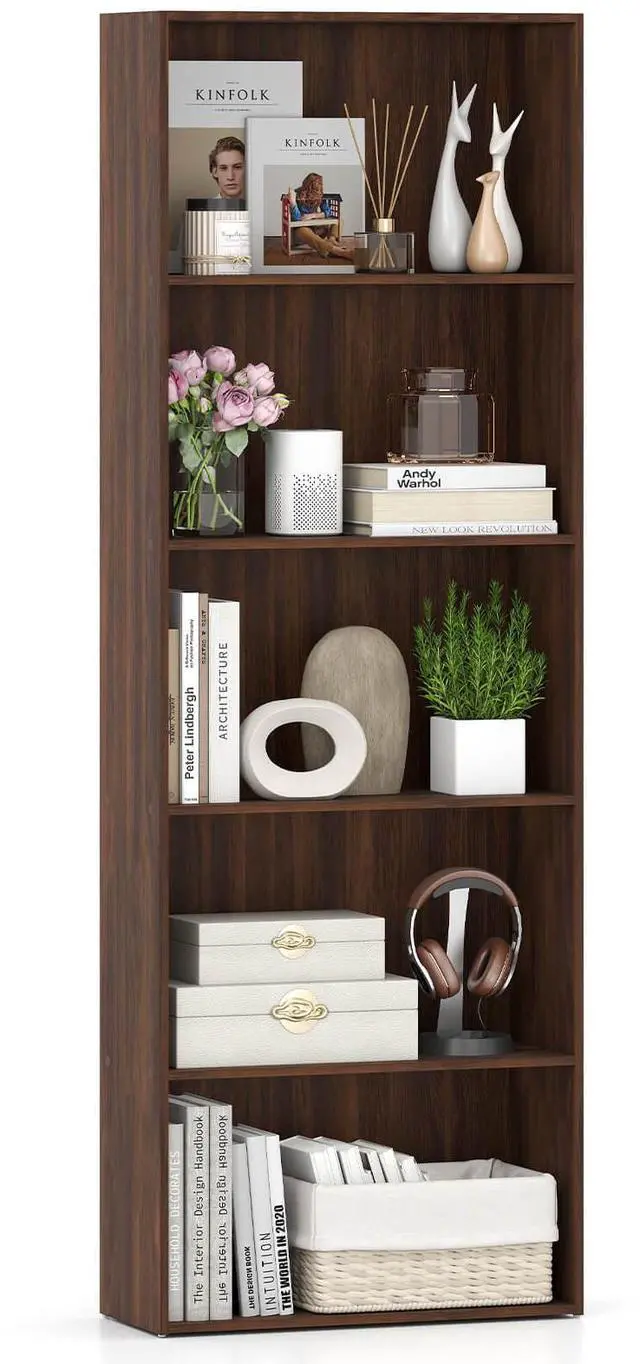 This 5-tier bookshelf boosts storage and display options, perfect for showcasing your favorite books, ornaments, or storage boxes. Constructed with thickened panels, each shelf boasts a high weight capacity for supporting items while maintaining stability. Utilize the included anti-toppling kit when placing the bookcase against the wall to prevent any accidents. Ideal for optimizing storage options in your living room, study, or office, this freestanding display shelf combines functionality with elegance.