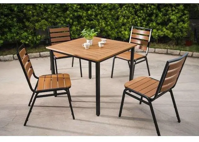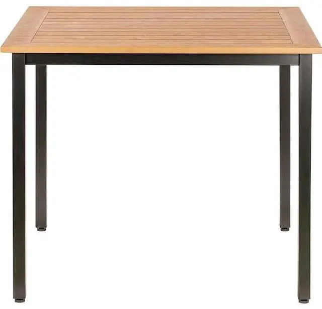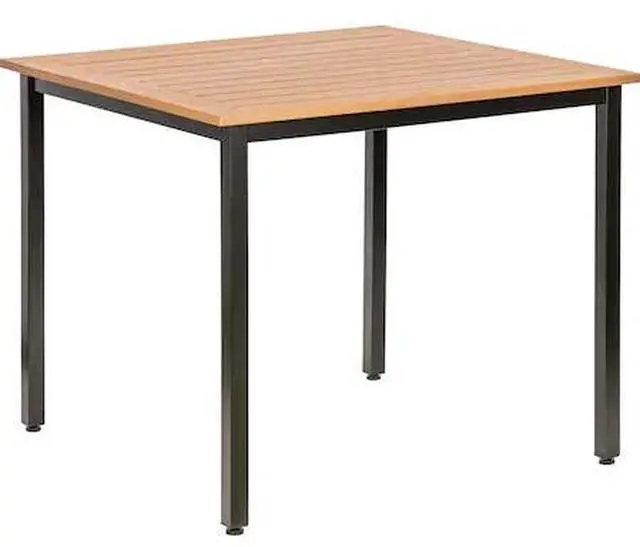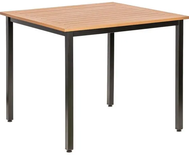 Lorell Teak Outdoor Table - Teak Square Top - Black Four Leg Base - 4 Legs - 36.60" Table Top Length x 36.60" Table Top Width - 30.75" Height - Assembly Required Resilient outdoor table with ultraviolet protection features a simulated teak wood finish that combines the sleek style of wood with the durability of polystyrene to withstand outdoor conditions. It will not splinter, warp or rot and never needs refinishing. Steel tube legs provide sturdy support to safely hold a variety of items without wobbling. Easy-to-use design makes building this table quick and simple to ensure proper assembly.