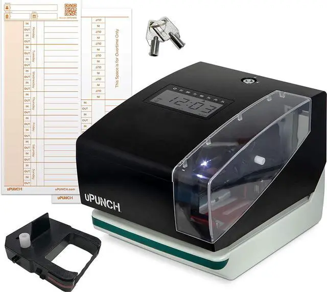 Package includes uPunch CR1000 Digital Time Clock and Date Stamp, 50 time cards, one ribbon & 2 keys