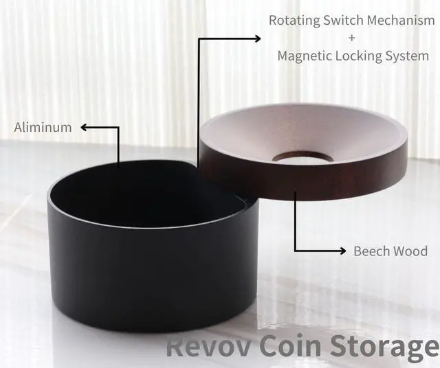 The upper lid of the Revov Coin Storage is crafted from high-quality beech wood, providing a warm and tactile feel every time you open it. The aluminum body ensures stability and durability, making it a long-lasting storage solution for your coins.