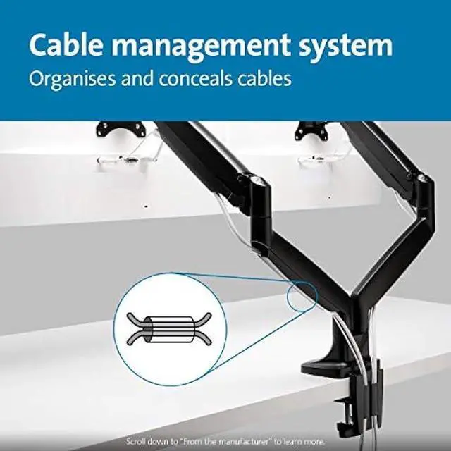 The Kensington SmartFit One-Touch Height Adjustable Dual Monitor Arm's built-in Cable Management System keeps cables out of sight and organized, held within the arm itself.. The Kensington SmartFit One-Touch Height Adjustable Dual Monitor is tested to meet ANSI/BIFMA performance and safety standards.