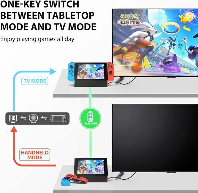 One-touch Display Switching: Press the TV/Tabletop Mode button at the back of the dock, you can choose Tabletop Mode or TV Output Mode. The nintendo switch dock for tv supports 4K, 1080P and 720P video output (Switch only supports 1080P).