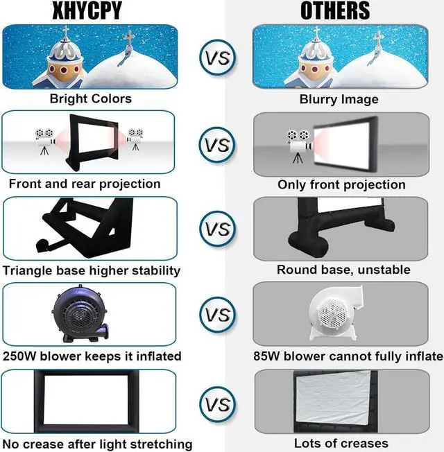 Front / Rear ProjectionThe inflatable movie screen is upgraded to thickened polyester material which support front and rear projection, 160°wide viewing Angle, 16:9 screen ratio, high color reduction. A lot of outdoor movie screens are only setup for front or rear projection, this one gives you both options which is greatly flexibility, you can see clear pictures on any side.
