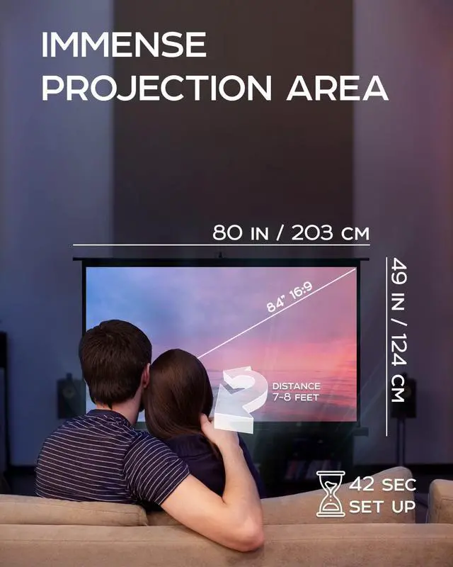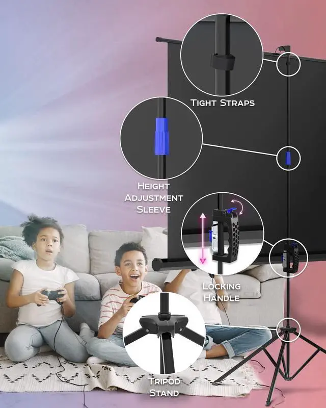 Indoor Outdoor projection movie screen is secured by convenient tight-straps, it could be carried to backyard or auditorium in a perfectly fitted projector screen bag, its retractable and adjustable design can be easily assembled in 3 steps