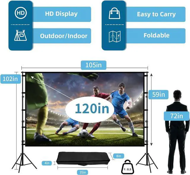 Stand: 120-inch diagonal, 16:9 aspect ratio, 160° viewing angle, 4K UHD, 3D projection. Whether you are alone or with your family and friends, you can enjoy the excellent viewing experience brought by this stand screen in any indoor and outdoor setting.
