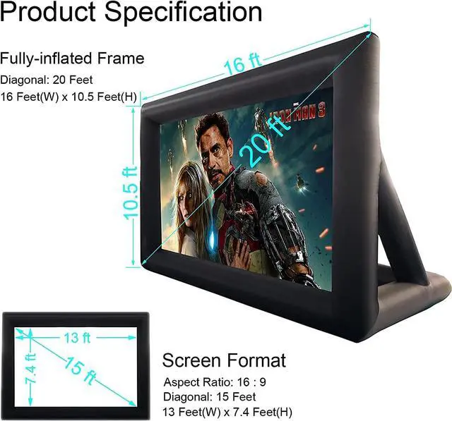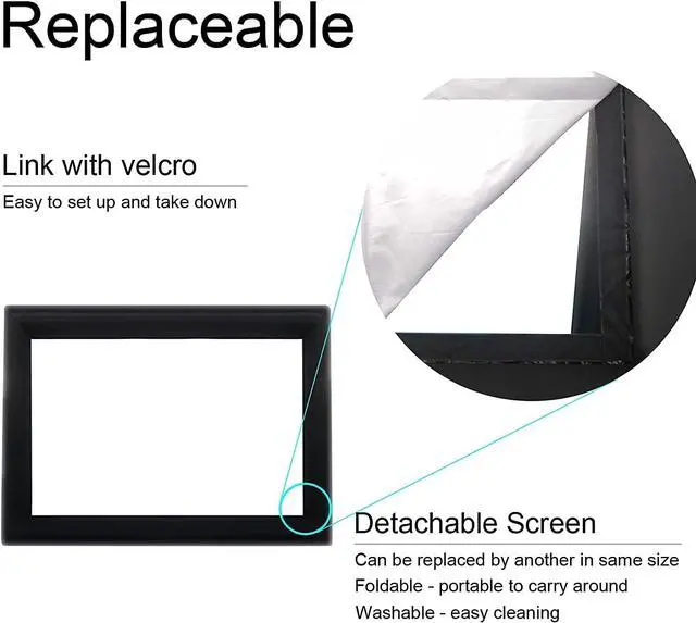 Larger Viewing Area, More AudienceTotal 16ft (W) * 10.5 ft (H), 16:9 screen ratio, accommodate more audience. Perfect for a large crowd. The blow up prejection screen is detachable and washable, the white movie curtain can be separated from the black inflatable frame and can be cleaned. The black part can be wiped with any cloth.