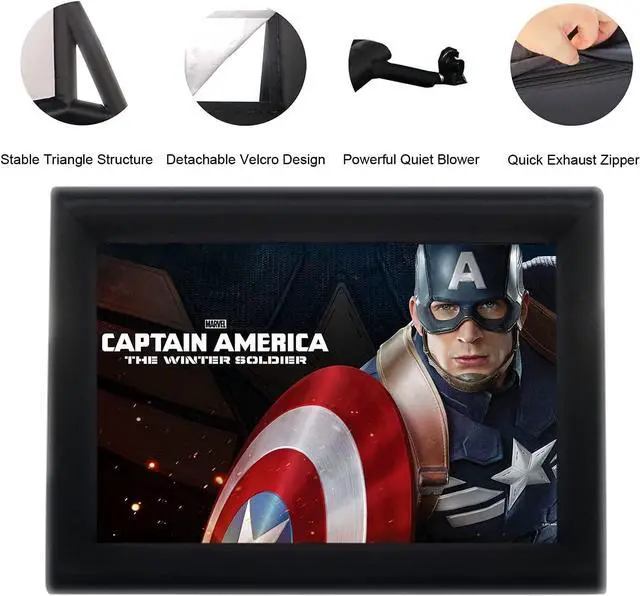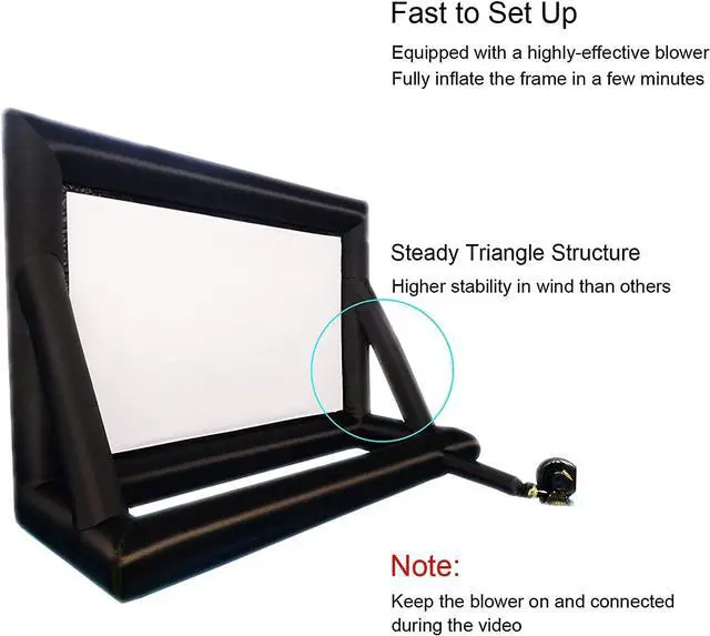 Easy to Set UpThis 14 feet inflatable movie screen can be installed in minutes. The white screen is held together with a black inflatable frame by velcro. The frame is then inflated with a blower to make it stand up. Finally, tethers and stakes are used to ensure safety and stability.