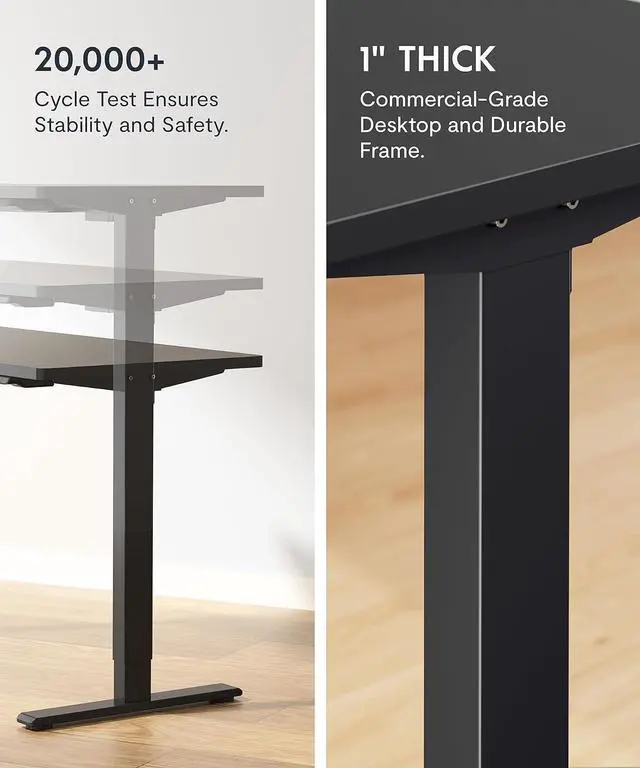 Electric Height Adjustable Lift System: The motor lift mechanism offers smoother height adjustments, from 28" to 47.6 " without 1 thickness of table top included), at a speed of 1" /second with low noise (under 50 dB) while running.