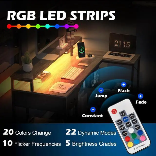 L DESK WITH LED LIGHTSPATENT PENDING! This home office desk features built-in LED lighting with 20 static colors, 22 dynamic modes, 10 speed grades and 5 brightness grades to create beautiful ambiance that enhances your room. The L shaped design suits for corner small space perfectly.