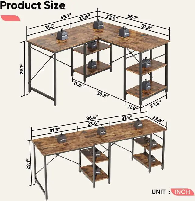 2 Different Configurations: Chosen it to be a 55" corner desk or a 86.6 " double long desk, it' s up to you. The l option makes full use of corner space and the long option is very suitable for 2 person working together