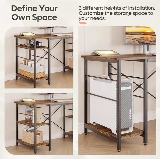 Flexible Storage Shelves: The shelves under desk can be installed at Right + Middle or Left + Middle when becoming an l-shaped desk; also can be Right + Middle when a long desk