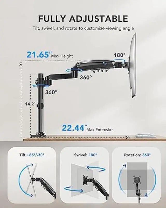 [Adjustable] This monitor arm single can remain completely stable at any angle without any extra work. Compared with other adjustment methods that make you adjust screws repeatedly, this gas spring vesa mount is easy to use, you only need to gently push the monitor stand desk mount up or down with one hand to accurately stop at the most comfortable height (up to 21.65 inch from the desktop)!