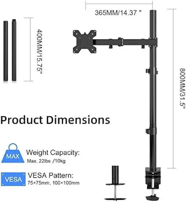 Compatibility - Single monitor mount ideal for most screens up to 27 and 22lbs with 75x75mm or 100x100mm backside mounting holes.