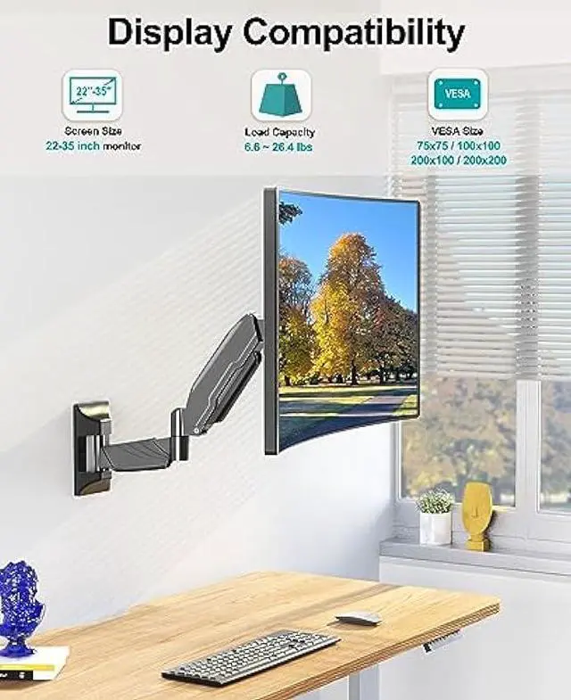 Fits UltraWide Screen - Our premium computer monitor wall mount widely fits 22 23 24 27 30 32 34 35inch monitors or TV weighing from 6.6 lbs to 26.4 lbs. What's more, our single monitor wall mount includes a VESA extension kit that expands the VESA plate size to a maximum of 200 x 200mm and can support a VESA size of 75 x 75/100 x 100/100 x 200/200 x 200mm. Compared to other similar monitor wall mounts, our ultrawide monitor mount covers almost all VESA sizes, giving you greater compatibility.