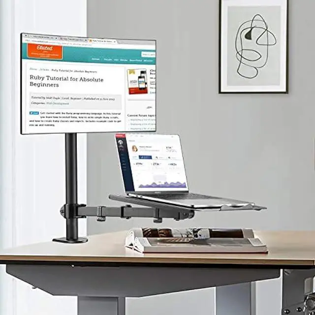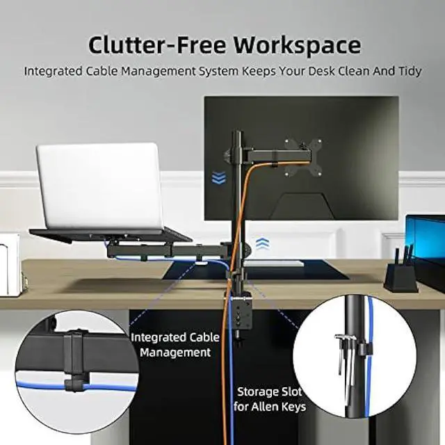 ERGONOMIC MONITOR ARM - If you've been working at the computer for long time, your eyes, shoulder and neck will more or less get painful. This monitor arm with laptop tray help relieve these fatigue by allowing you to position your monitor screen at the optimal viewing height, angle, position, and distance.