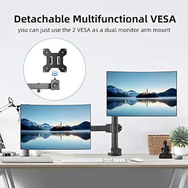 MULTIFUNCTIONAL DESK STAND - With the detachable laptop tray, this desk monitor arm can be used for a monitor and a pc, or used as a dual monitor desk mount without the notebook tray. Venting holes and bottom edge lip prevent overheating and falling. With cable and slot management, no worry about desk messing up.