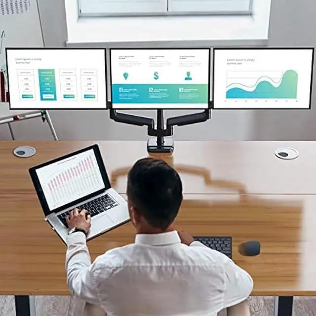 Desk Space Saver - 3 monitor desk mount can free up much more valuable work space comparing with normal monitor stand by holding up three screen in space.