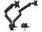 FEATURES: Dual monitor arm has counterbalanced, mechanical spring arms which are easily height adjustable. Detachable VESA plate comes off with the push of a button, making installation super simple, and slides back on with a click. Integrated cable management keeps your cables out of sight and neatly organized. Comes with interchangeable C-clamp or grommet base mount for use on desktops.