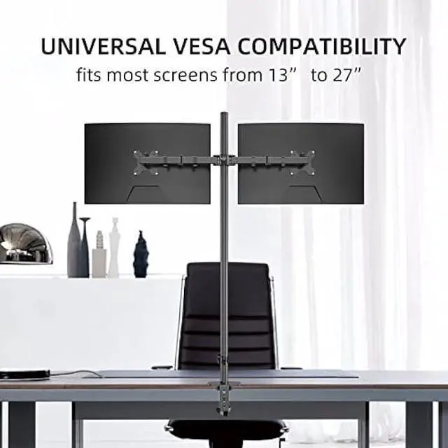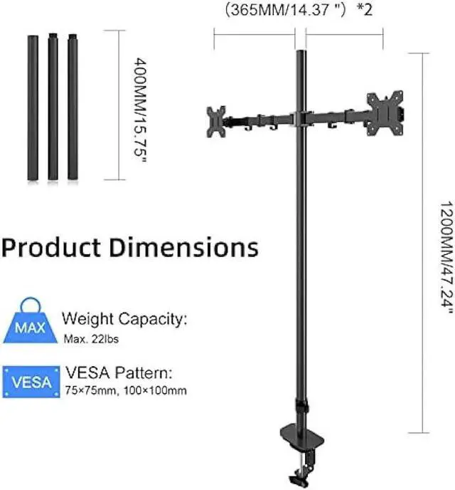 SOLID CONSTRUCTION: This desk monitor mount is heavy duty, sturdy as can be. The bolts hold it in position very well. very flexible and sturdy. The 47 inch center pole allows you to adjust the monitors between sitting and standing positions. Integrated cable management is included to keep AV and power cords clean and organized via clips along the arm and center pole.