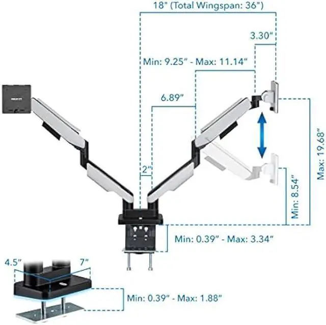 HEAVY-DUTY FULL MOTION DUAL ARM: The already built in heavy-duty tilting and gas spring mechanisms allow for smooth and stable adjustment of very large screens up to 35 / 44 lb including curved widescreen monitors. The full motion design including 18 arm extension, 180° swivel, 70° total tilt and a height range from 8.54 to 19.68 allows for the perfect viewing angle and height.