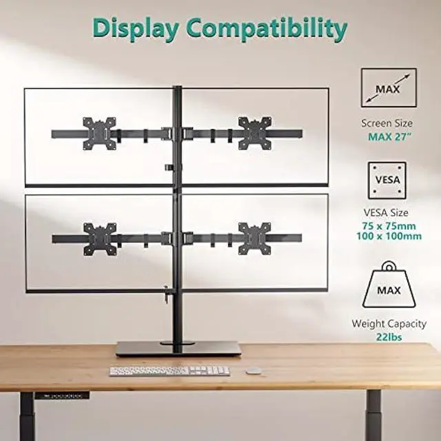 Compatibility: Fits most LCD, LED flat screen TVs and monitors up to 27 inches, and support weight up to 22lbs per screen. Compatible with VESA 75x75mm or 100x100mm. VESA plates are detachable and height adjustable.