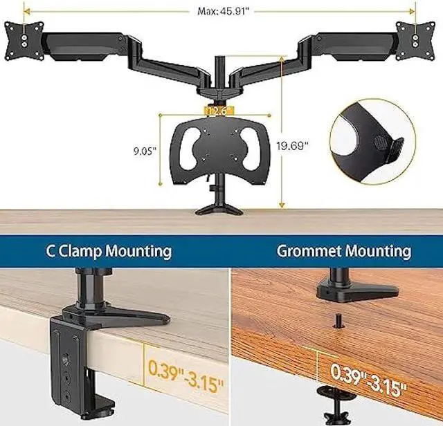 Sturdy Stand - The supported C clamp and grommet mounting options provide sturdy and reliable support for your monitors and laptop. Choose the suitable mounting option as you need. The desk thickness must be within 0.39 - 3.15 inch. C clamp fits all material desk. Grommet mounting only fits wooden and plastic desks. (Note: Please follow the installation steps in the instruction manual to install)