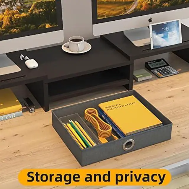 Perfect Storage with Drawer Unique original design, patented products. Our computer monitor riser includes 13 inches practicality slide-out drawers, for storing items like post-it notes, writing utensils and mobile devices. (USPTO Patent Application is Pending )