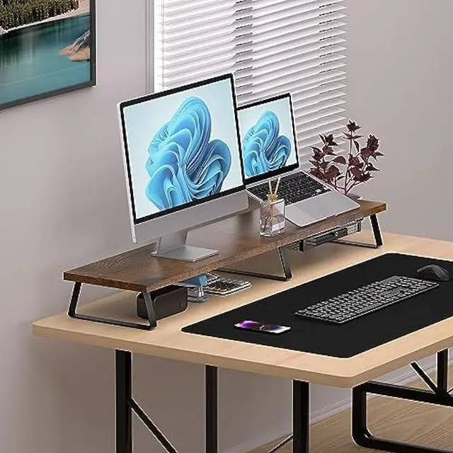 Unique Design Large Monitor StandUnlike other regular monitor stands, this stand features a unique design that adds a touch of modernity to your workspace. Combining metal drawers with wooden materials, it exudes a sense of sophistication and elegance. It creates a stylish and functional atmosphere in your office.