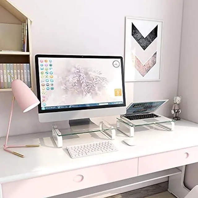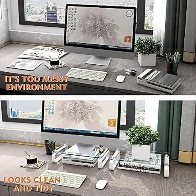 Personality Design Our Design team spent a lot of time on this computer monitor stand riser design. The riser top is made of clear tempered glass with round polished edges, not only safe for human body but also looks elegant