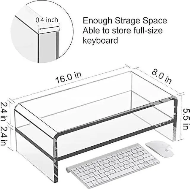 UNIVERSAL SIZE The acrylic monitor stand is specially designed to fit most standard size displays. The size of the computer riser board is 16 in (width) x 5.5 in (height) x 8 in (depth). The stand can be used as a riser for computer monitors; it can also be used as a desk file organizer, or used to place TV and set-top boxes.