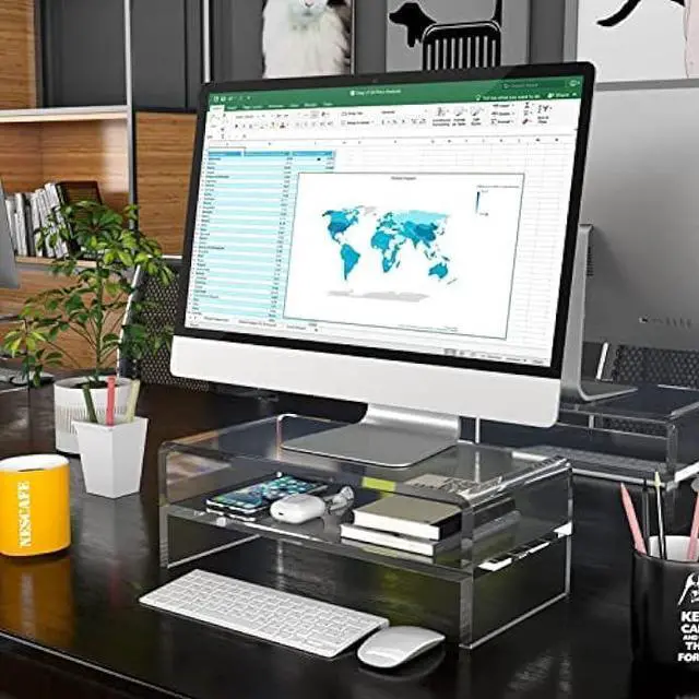 DOUBLE STORAGE There are 2 tier of storage provided under the monitor stand, it can store mice, mobile phones, tablets, cigarettes, and lighters. If it is used in an office space, it can store staplers, spare files, and calculators. The transparent monitor stand keeps your desktop organized.