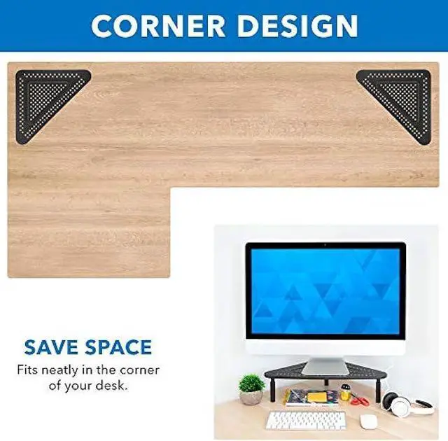 EXTRA STORAGE AND SPACE SAVING DESIGN: This corner monitor stand is designed specifically to provide minimal space-saving storage while raising your screen. The extra storage underneath is perfect for storing away your keyboard, mouse, or other home office supplies.