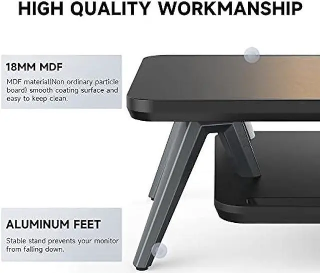 STRONG & STABLE DESIGNSolid aluminum footing providing strong support, max holding capacity 88lbs/40kg. Comes with 4 rubber pads that make the computer monitor stand more stable, and the desktop remains scratch-free, even at high temperatures or under squeezing. The metal foot will not be out of shape and it will not wobble and sag or crack over time.
