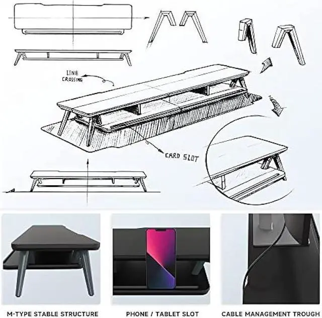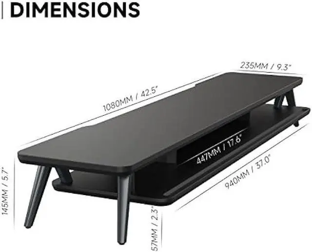 2 TIER DESKTOP ORGANIZERAt longest 42.5 inch wide, longer size with more space. This laptop riser is big enough to support two monitors. It has 1 universal device holder slot and 3 high capacity compartments. You can easily store your office accessories & supplies under your monitor stand to keep your desktop tidy. Our monitor stand rise comes with cable management slots that can make your cord stay organized.