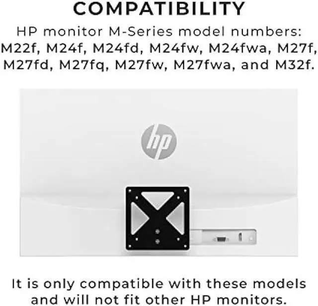 M-Series model numbers: M22f, M24f, M24fd, M24fw, M24fwa, M27f, M27fd, M27fq, M27fw, M27fwa, and M32f. It is only compatible with these models and will not fit other HP monitors.