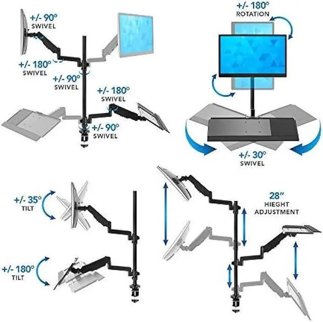 FULL MOTION ADJUSTABILITY: Our monitor and keyboard stand features pneumatic counterbalance gas springs that allow you to easily tilt 35°, swivel 180°, and rotate 360°.