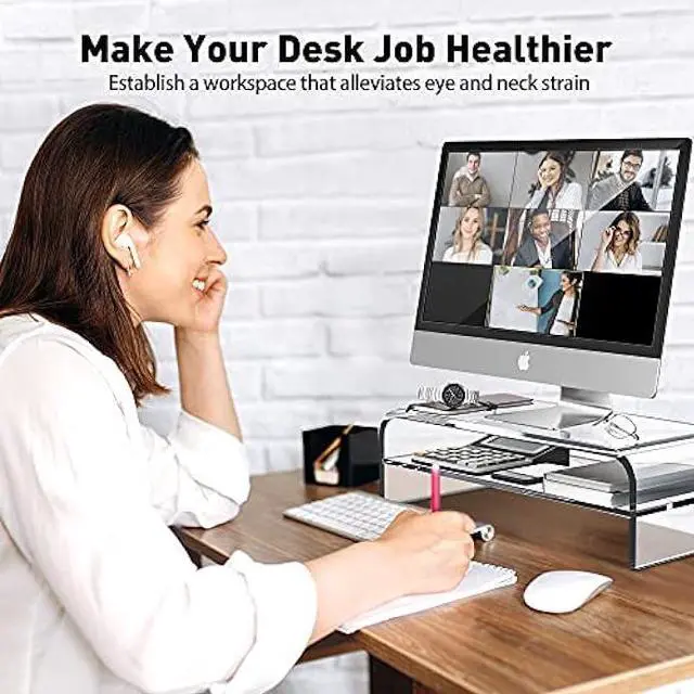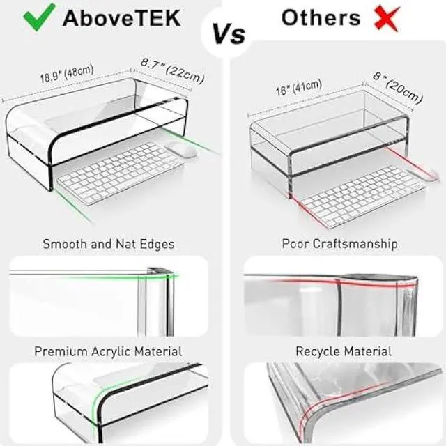 Create More Space: Two-tier clear monitor stand occupies little room on your desk while giving you the storage space you need to keep your desk neat and tidy; easily store your office supplies on the shelf and tuck your full-sized keyboard and mouse in the practical space underneath.