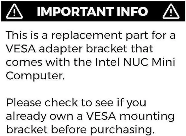 IMPORTANT NOTE: This is a replacement part for a VESA adapter bracket that comes with the Intel NUC Mini Computer. Please check to see if you already own a VESA mounting bracket before purchasing.