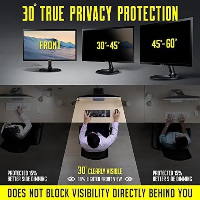 Dark Screen For Others -- Clear view for you. The computer privacy filter makes the screen appear dark when looking at it from an angle (the angle is about 30°- 60°), but bright when looking directly at it. To change the privacy angle from 60° to 30° degrees - simply adjust your monitors brightness level.