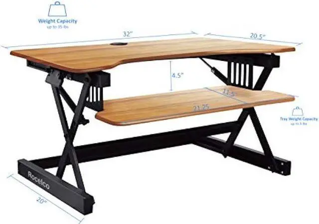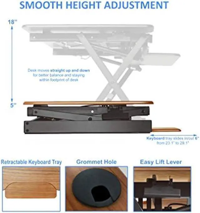 RETRACTABLE ERGONOMIC KEYBOARD TRAY: 4.5 spacing between keyboard tray and desktop keeps monitor at proper ergonomic height to prevent neck strain while sitting or standing, keyboard tray extends for optimum comfort. Large 21 x 11 keyboard tray size will hold a laptop if needed.