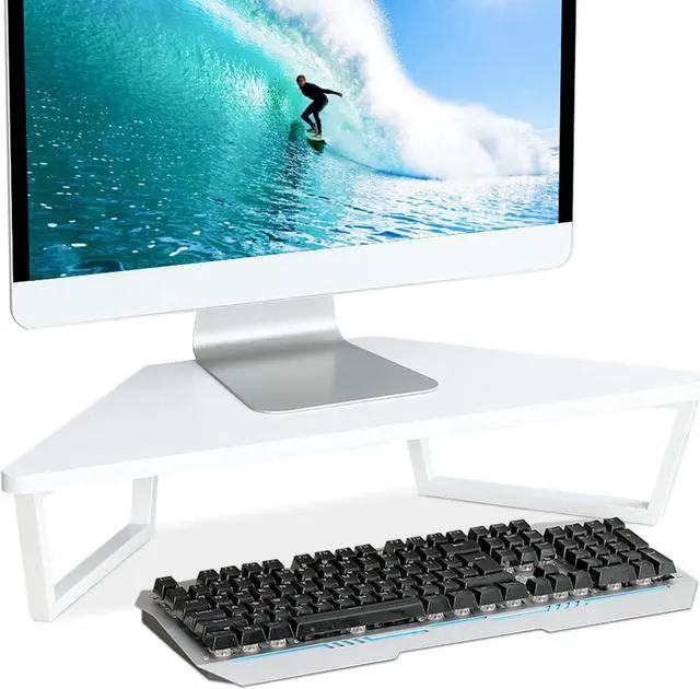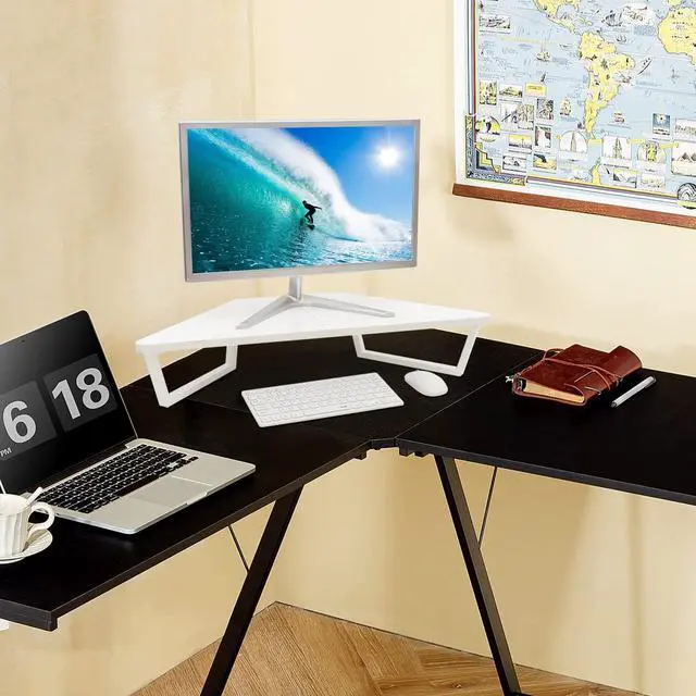 Monitor Stand for Corner SpaceThis triangle monitor stand fits in a corner nicely, such as L-shaped desk Corner desk Rectangular table corner. It can be monitor/PC/TV/laptop/plant stand riser, provide you a healthier eye level.